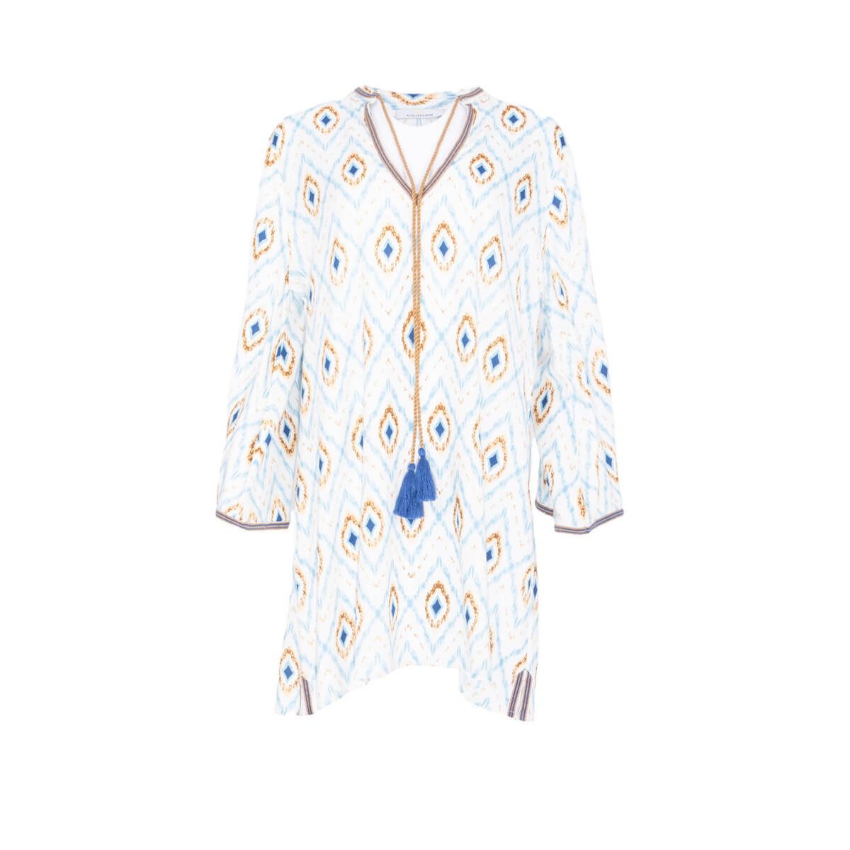 Γυναικείο κοντό καφτάνι σε βισκόζη με βε λαιμόκοψη και φαρδιά μανίκια με κεντητή λεπτομέρεια. Διαθέτει μικρό άνοιγμα στο πλάι και διακοσμητικό κορδόνι στο λαιμό με φουντίτσες.