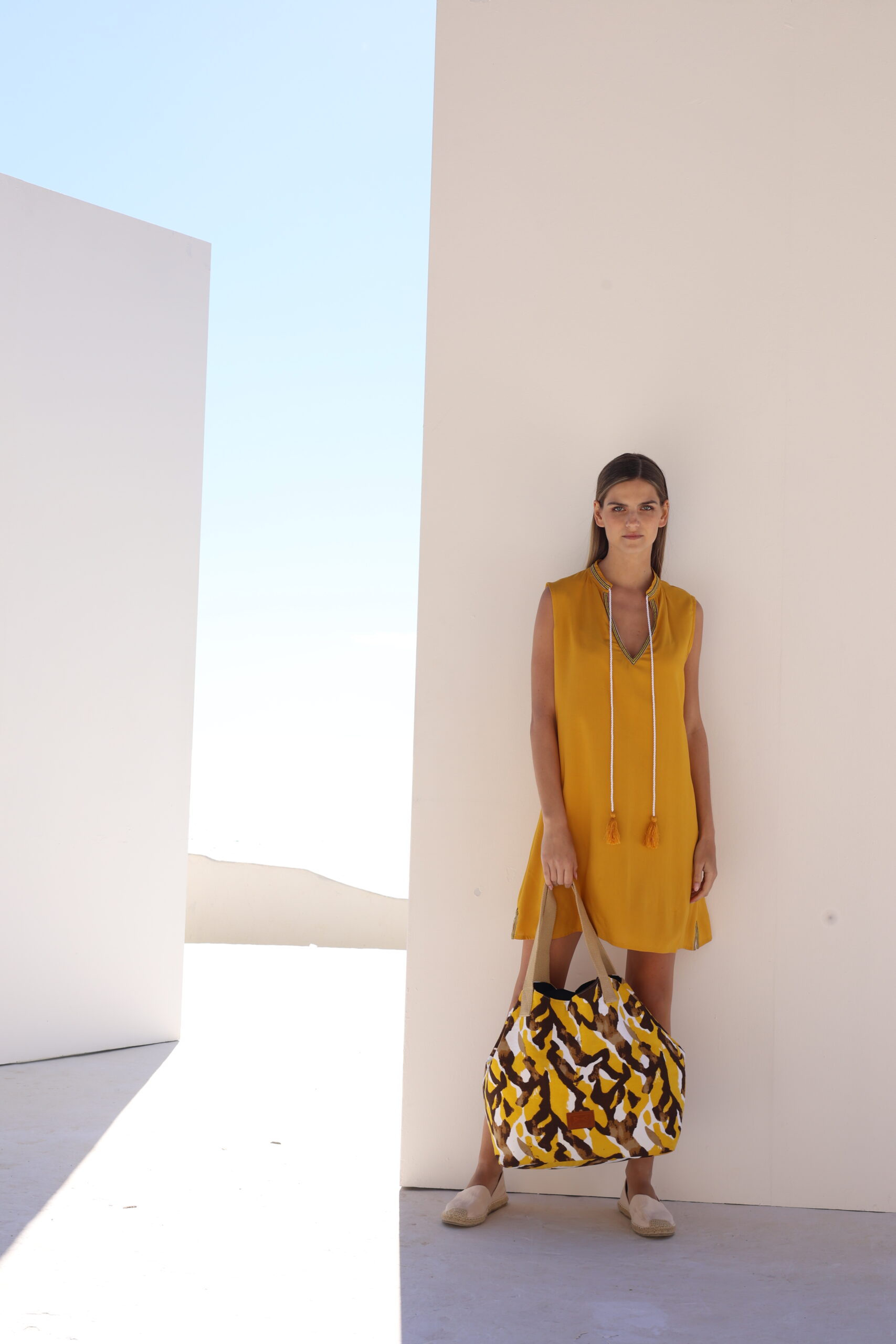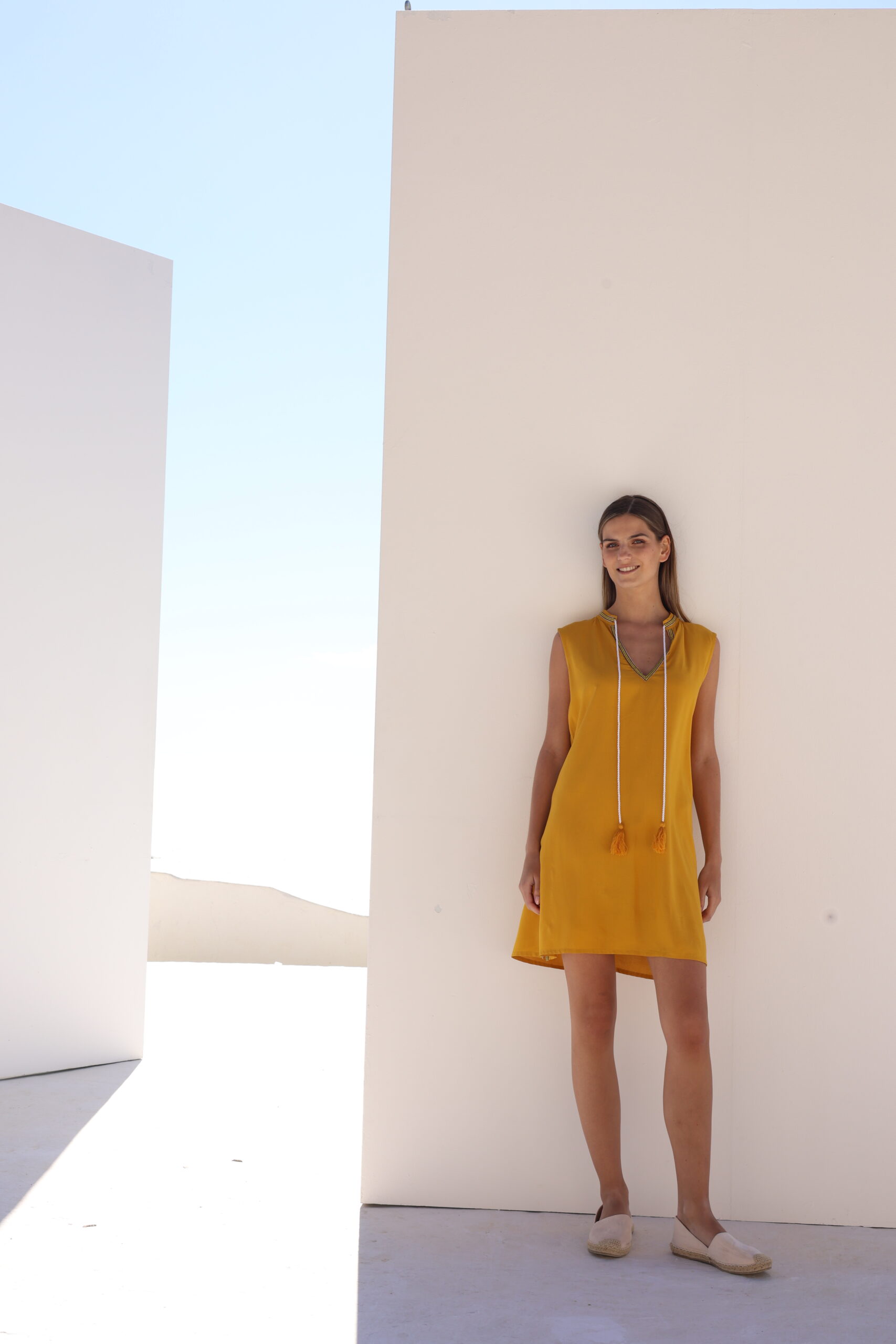Γυναικείο κοντό καφτάνι με V λαιμόκοψη και με κεντητή λεπτομέρεια. Διαθέτει άνοιγμα στο πλάι και διακοσμητικό κορδόνι στο λαιμό με φουντίτσες.