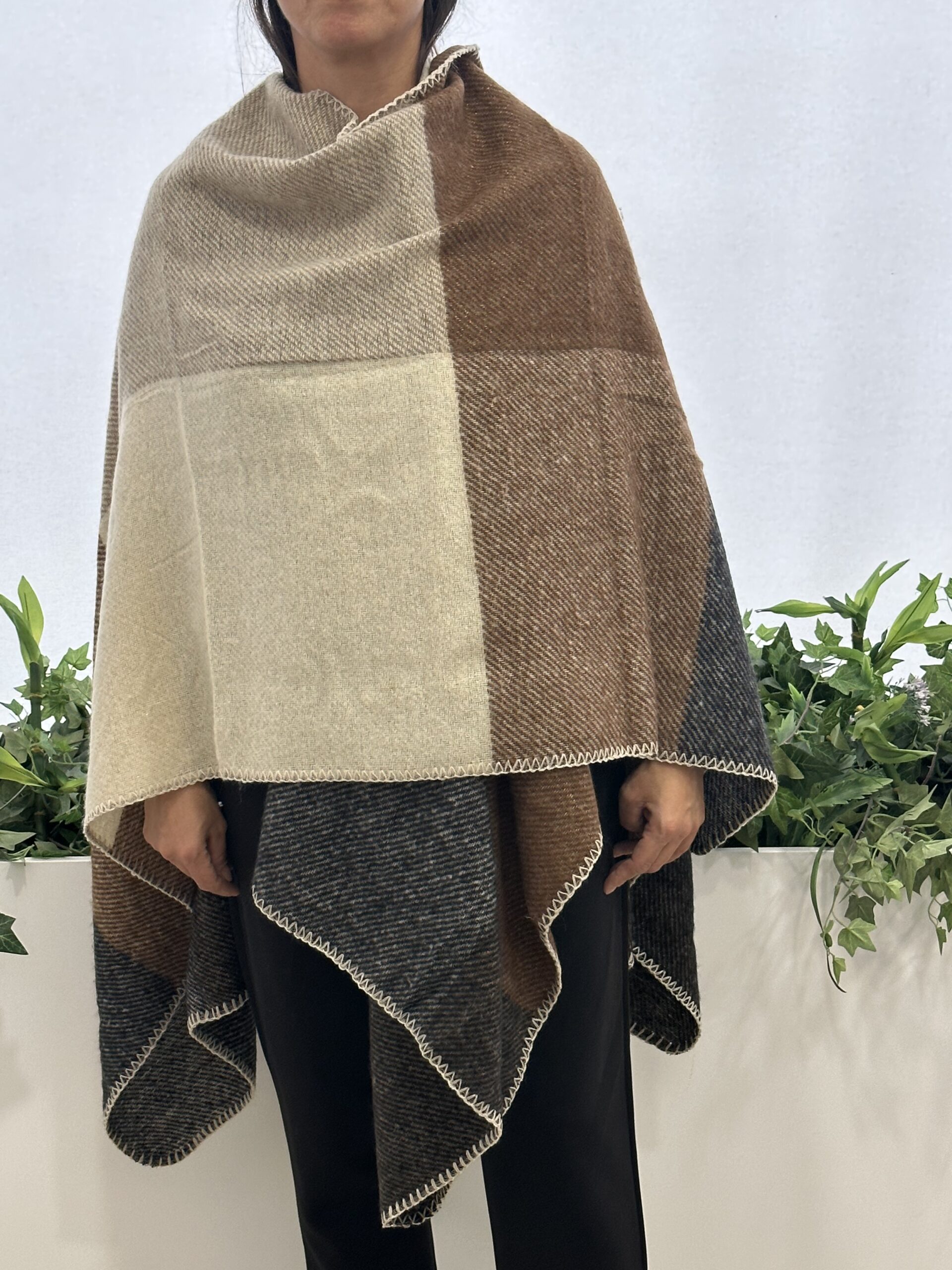 Πόντσο από απαλό και ζεστό υλικό. Με καρό σχέδιο σε διάφορες αποχρώσεις και ρέλι στο τελείωμα.