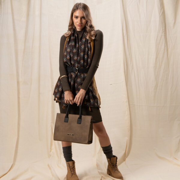 Εσάρπα σε γήινους τόνους με σχέδιο λουλούδι και δίχρωμες φουντίτσες στο τελείωμα. Ένα αξεσουάρ που θα απογειώσει κάθε απλό σύνολο.