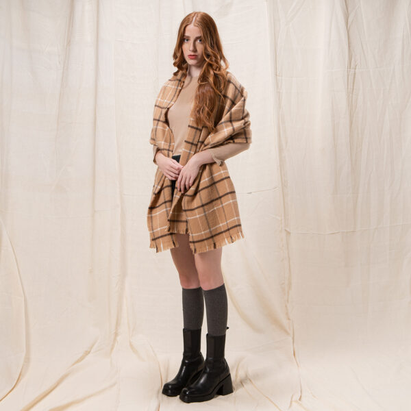 Εσάρπα σε γήινους τόνους με σχέδιο καρό και λεπτή ρίγα. Διαθέτει ξέφτια στο τελείωμα. Χαρίζει ζεστασιά και άνεση.